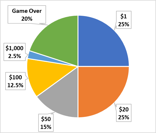 You are tasked to create a program for a game show called "Wheel of Fortunate Events". In the game, players spin a large wheel for cash prizes. The wheel is split up into segments, like slices of a pie. The player keeps spinning the wheel and accumulating cash until they land on Game Over and cash out their total. The segments have different sizes, so the probability of each outcome is different: