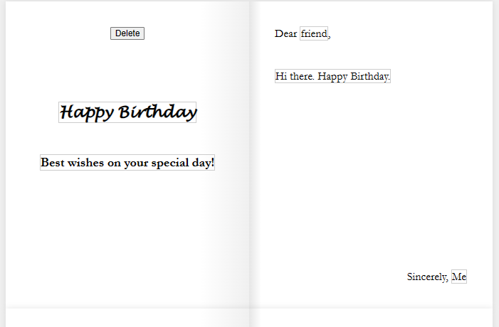 Last but not least, let’s make the cards editable. You may have noticed that there’s a contenteditable attribute on each of the <span>s! This makes the element into something that works both as text and an input.