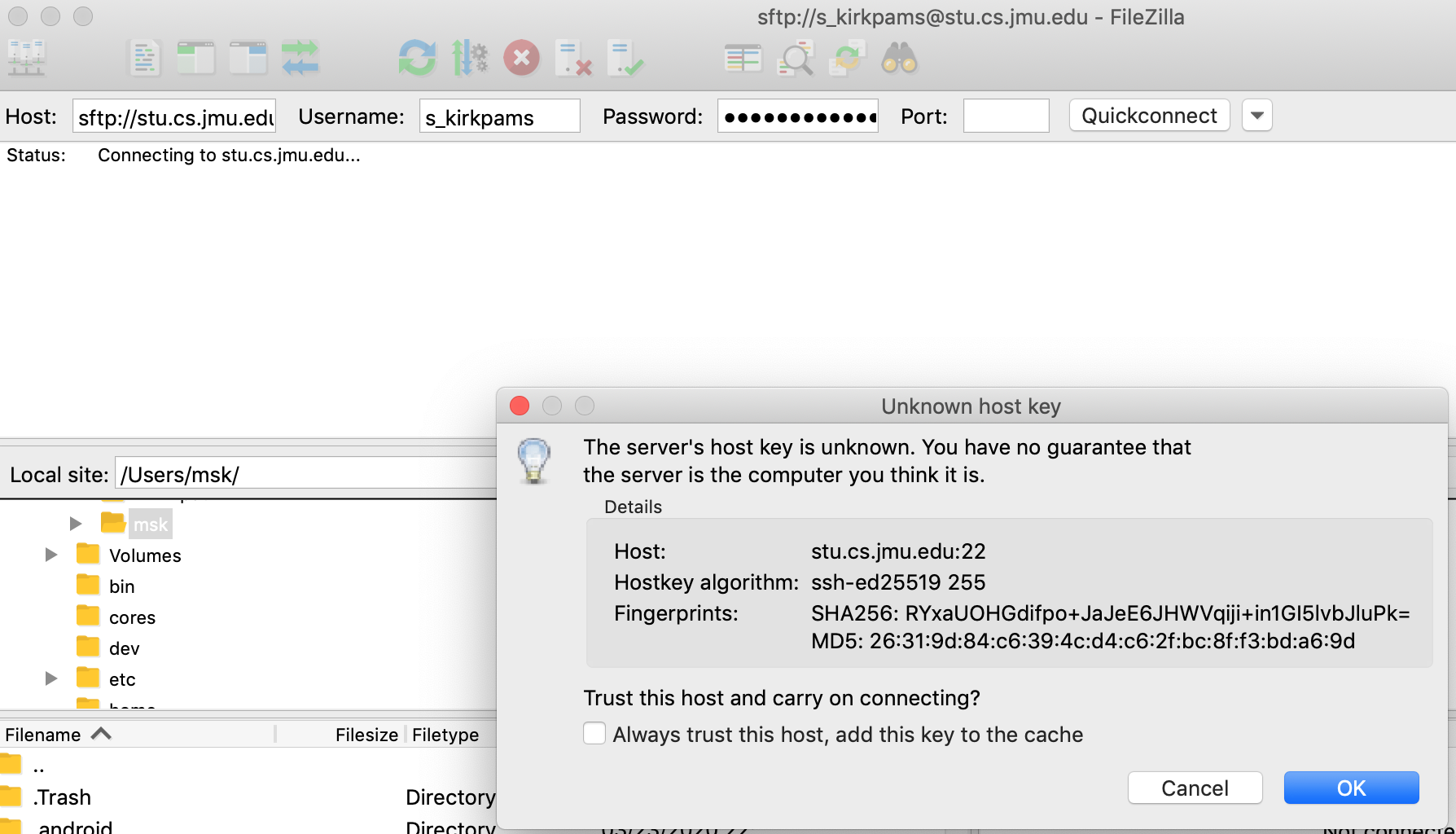Once you have FileZilla installed, you will connect to stu.cs.jmu.edu using the sftp:// protocol as shown in this screenshot, setting your username and password as appropriate. The first time you connect to stu, you will get the "Unknown host key" pop-up box as shown; click "OK" to continue.