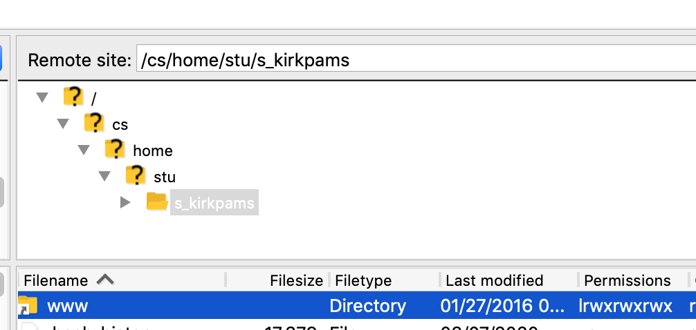 Once connected, the right side will show a path on the "Remote site:" that looks like /cs/home/stu/username. This screenshot shows an example. Under the "Filename" list, scroll down until you see the "www" directory shortcut. Double-click on it, and you will see something that looks like this screenshot. Notice that the "Remote site:" has changed to /cs/www/stu/username, which is the base directory of your web site.
