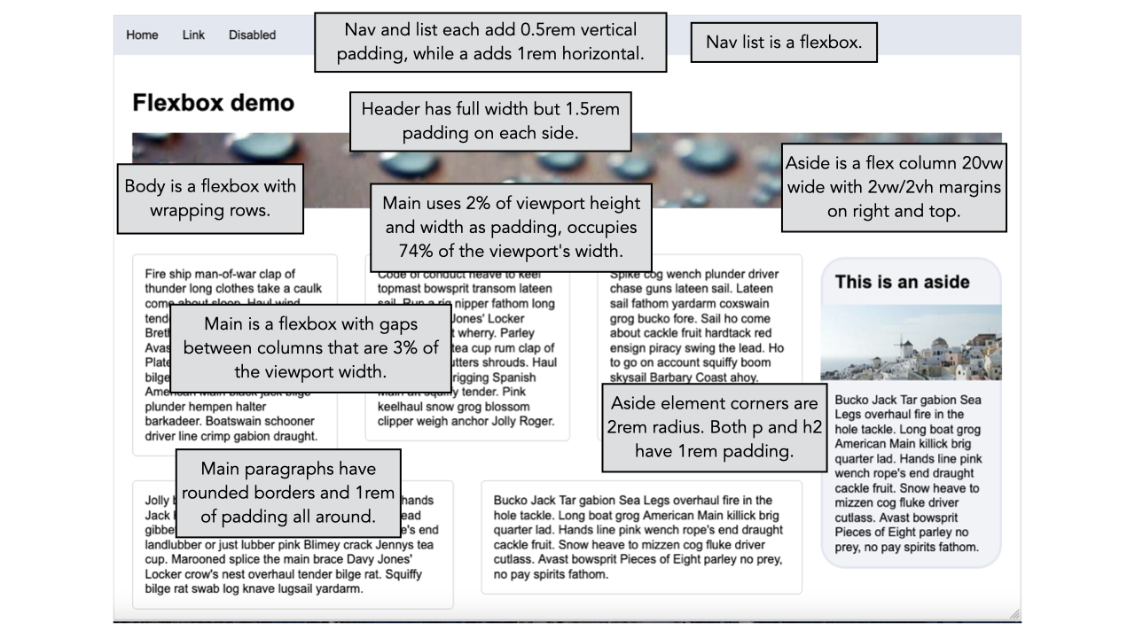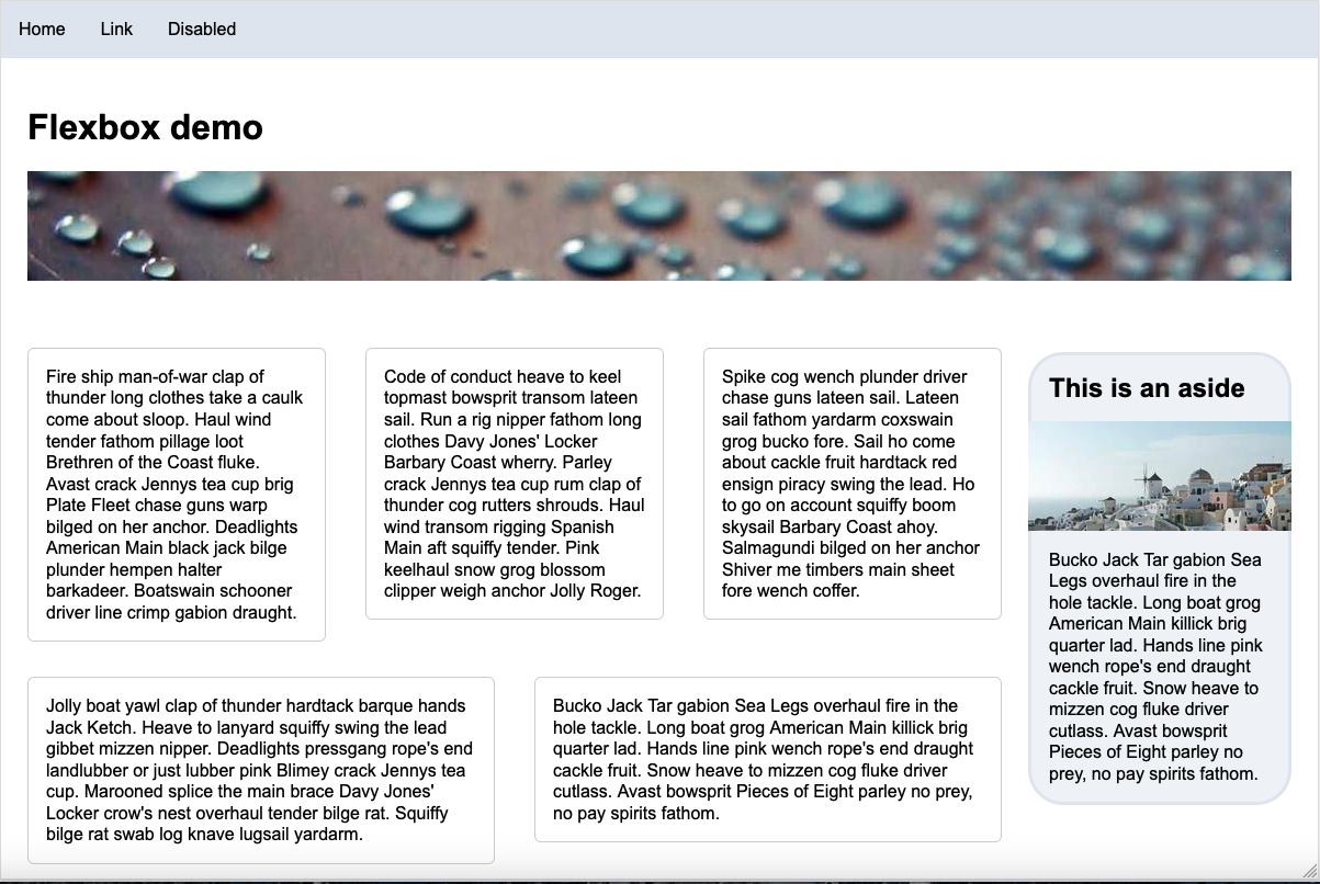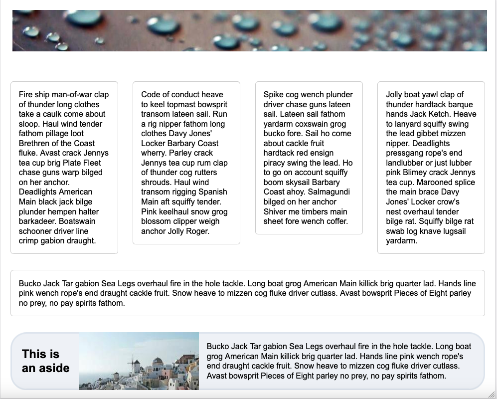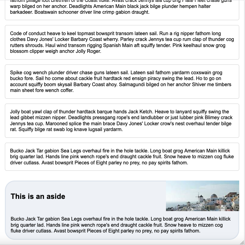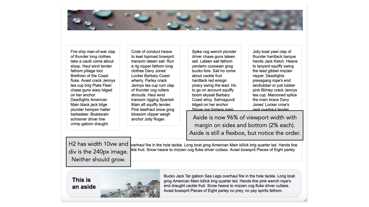 - Aside is now 96% of viewport width with margin on side and bottom (2% each). Aside is still a flexbox, but notice the order.