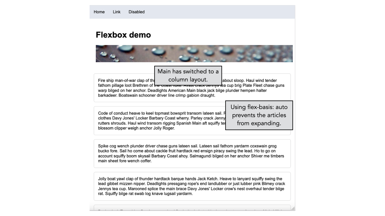 - Using flex-basis: auto prevents the articles from expanding.